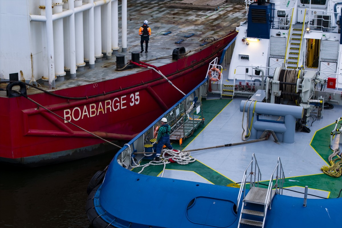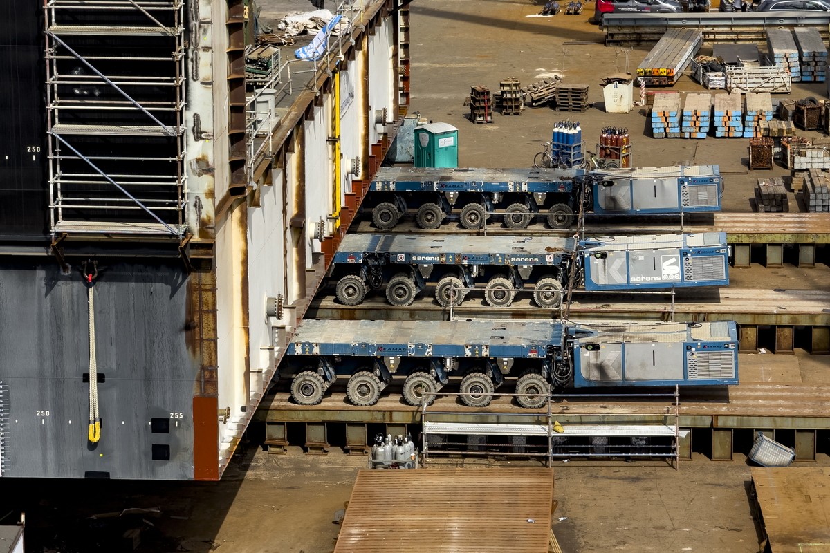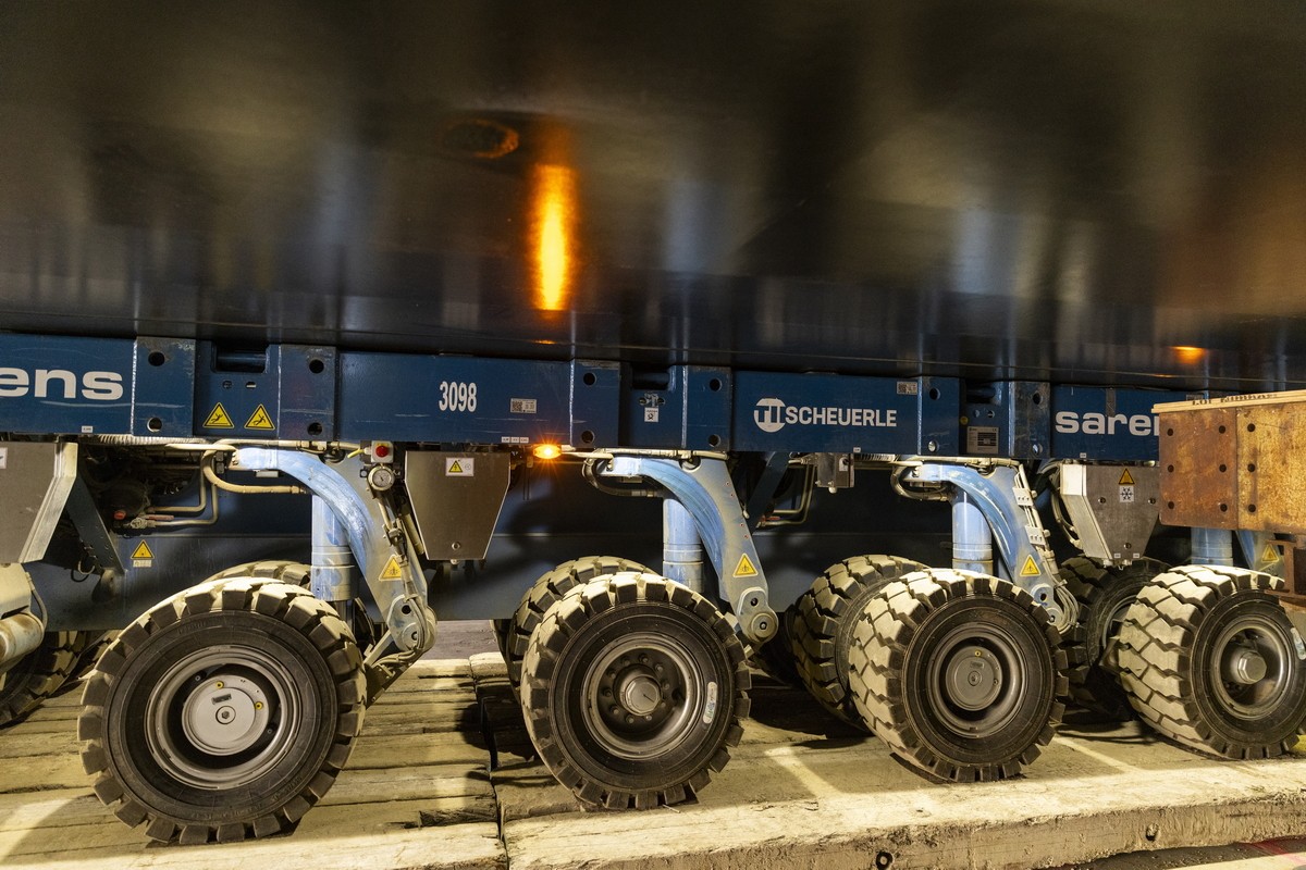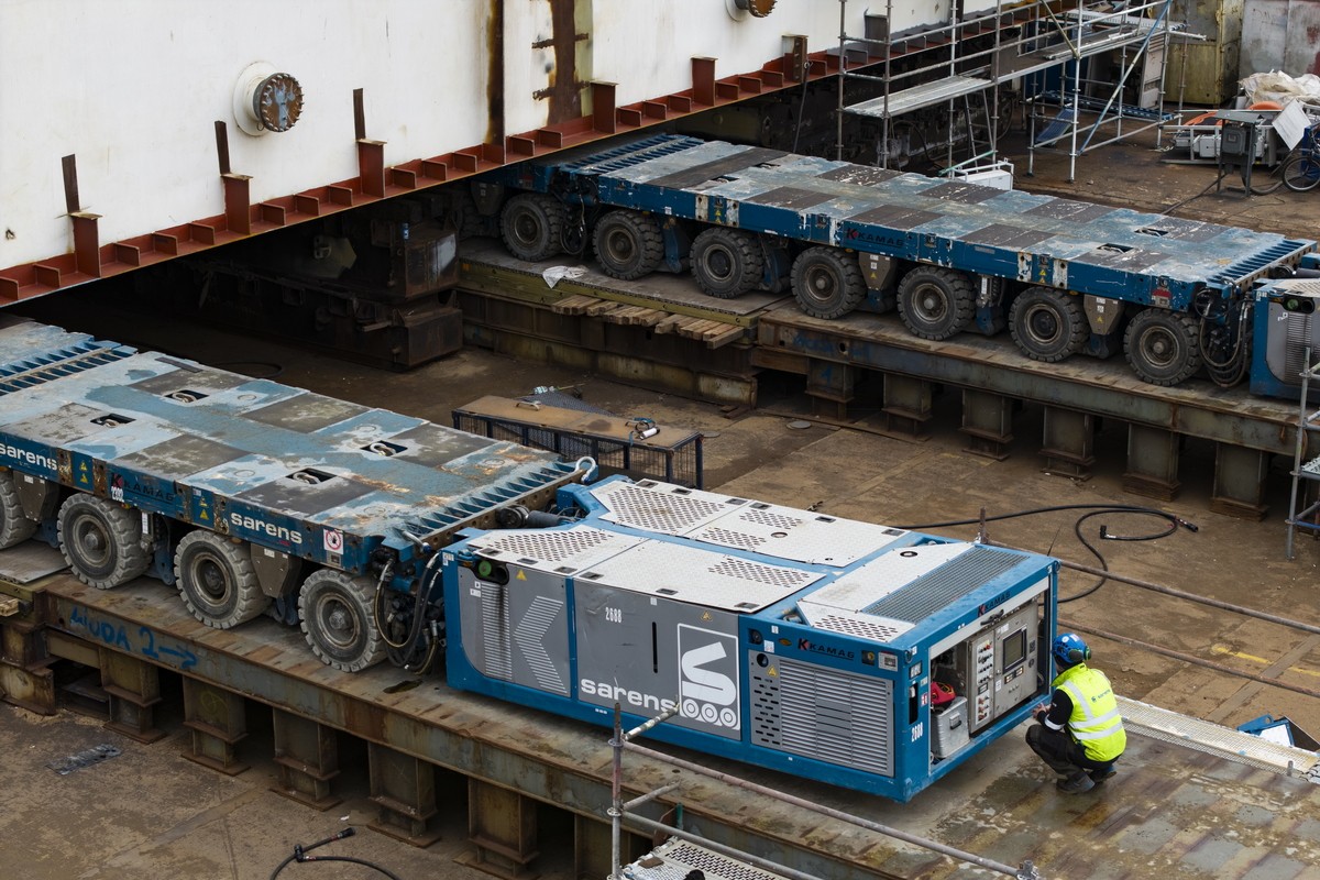 Do przemieszczenia modułu wykorzystano samobieżne transportery modułowe (SPMT). Wieloosiowe zestawy pozwalają na kontrolowane i precyzyjne manewrowanie wielotonowym ładunkiem na nabrzeżu.