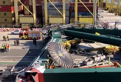 Jedna nabrzeżowa suwnica kontenerowa została powalona i zniszczona, druga - poważnie uszkodzona (prawdopodobnie też nie do naprawy) prze...