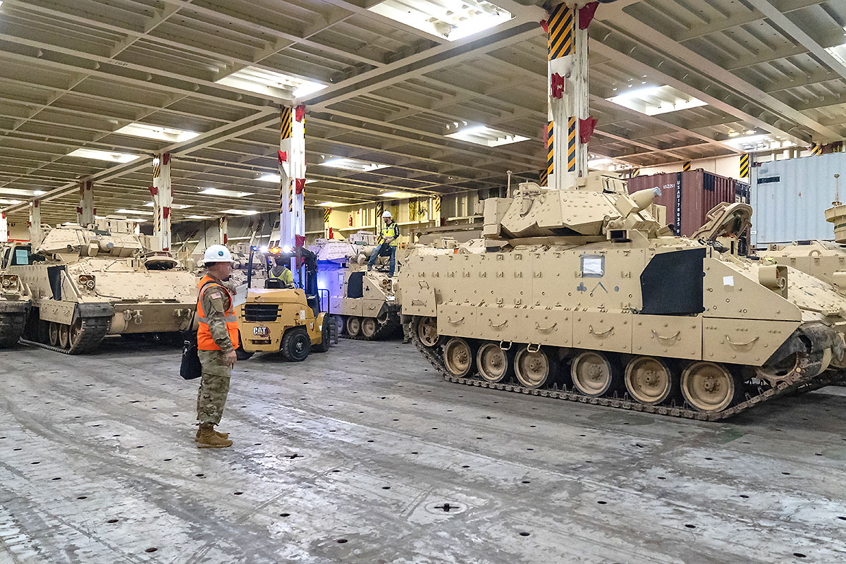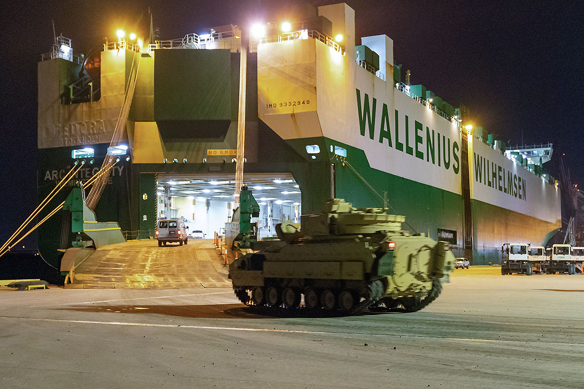 Załadunek Bradleyów na samochodowiec ARC Integrity w Stanach Zjednoczonych