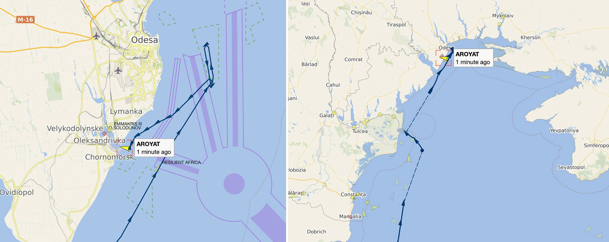 Przed dotarciem do portu, Aroyat i Resilient Africa nadłożyły drogi, stosując "objazd", który zaprowadził je znacznie dalej na północ od Odessy. W odstępie około trzech godzin, oba statki przyjęły pilotów z ukraińskiej łódzi pilotowej Lotsman Mazhara, a następnie ponownie skierowały się na południe w kierunku Chornomorska.