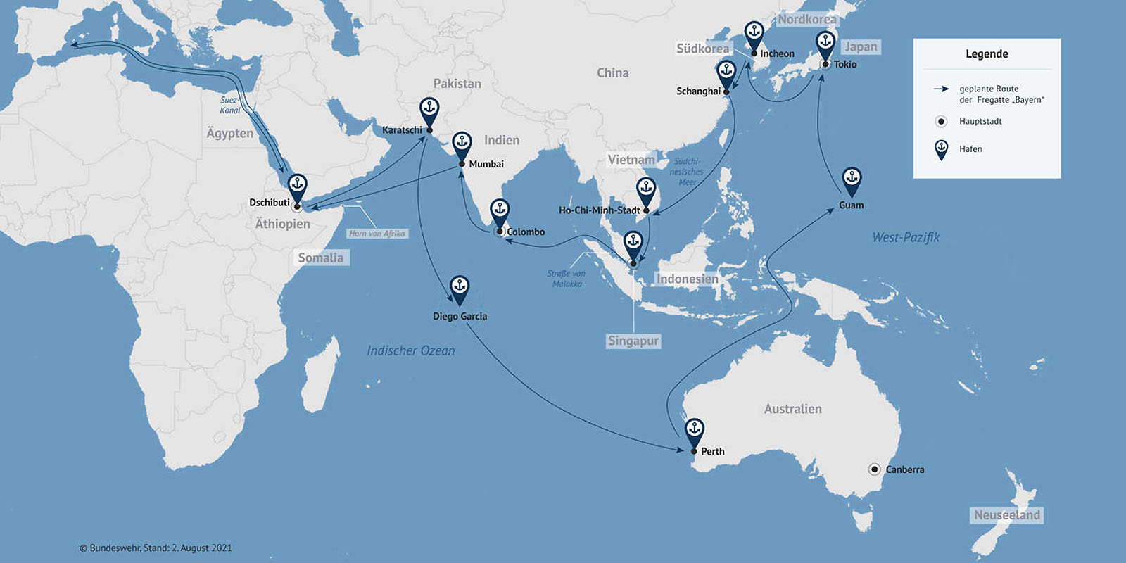 W jej ramach fregata Bayern odwiedzi m.in. Australię, Japonię, Koreę Południową oraz Wietnam i Singapur.