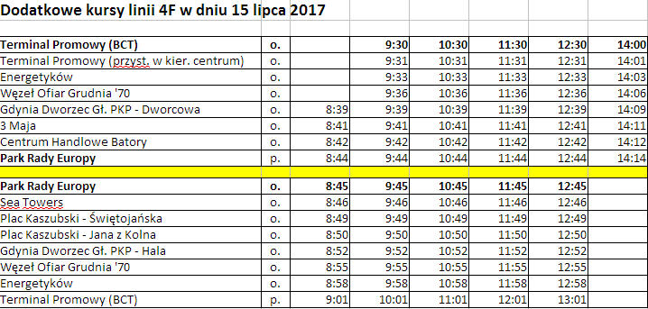 Na miejsce można dotrzeć darmowym autobusem 4F z przystanków Park Rady Europy oraz przystanek Gdynia Dworzec Gł. PKP - Hala. Rozkład jazdy dodatkowych kursów do terminalu dostępny w galerii poniżej.