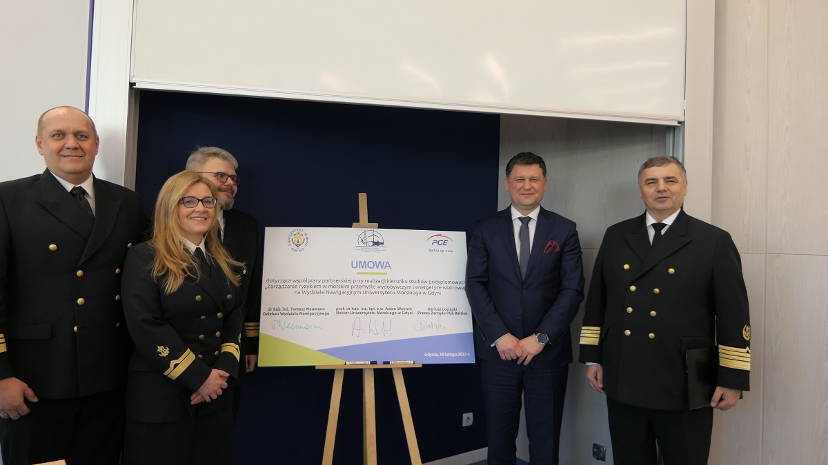 Na Wydziale Nawigacyjnym Uniwersytetu Morskiego w Gdyni odbyła się dziś uroczystość podpisania umowy partnerskiej z PGE Baltica dotyczącej współpracy przy tworzeniu studiów „Zarządzanie ryzykiem w morskim przemyśle wydobywczym i energetyce wiatrowej”. Pierwszy semestr studiów rozpocznie się już w marcu.