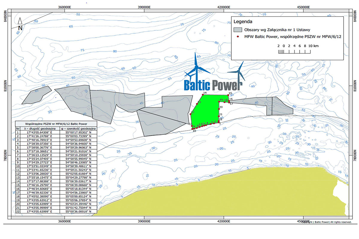 Farma Baltic Power o mocy do 1,2 GW ma być zlokalizowana ok. 23 km od brzegu na wysokości Choczewa i Łeby. Po zakończeniu budowy w 2026 r. będzie w stanie zasilić w czystą energię ponad 1,5 miliona gospodarstw domowych.