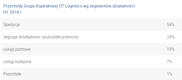 Od I kwartału 2018 r. Grupa Kapitałowa dokonała nowego podziału przychodów na cztery główne segmenty działalności: usług portowych, spedycji, usług kolejowych oraz żeglugi śródlądowej wraz z pozostałymi przewozami.