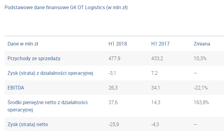 Grupa Kapitałowa OT Logistics, największy operator portowy w Polsce i lider w obszarze żeglugi śródlądowej w Europie Środkowo-Wschodniej, zanotowała 477,9 mln zł skonsolidowanych przychodów w I połowie roku, co oznacza wzrost o ponad 10% r/r. Grupa poniosła w tym okresie stratę netto, która jest przede wszystkim wynikiem wysokich kosztów finansowych. OT Logistics prowadzi prace nad refinansowaniem zadłużenia i może wyemitować nowe akcje, co przełoży się na obniżenie kosztów obsługi zadłużenia.