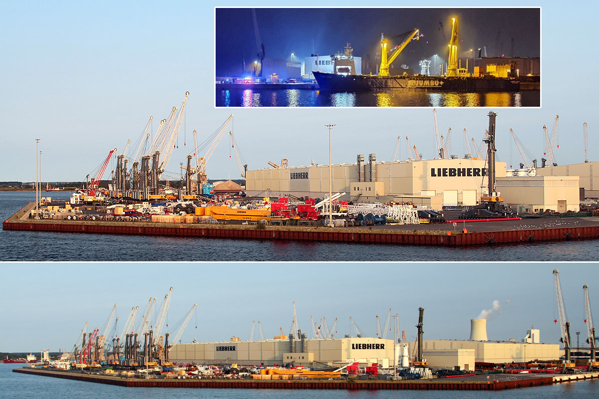Fot.: Piotr B. Stareńczak (ujęcia fabryki Liebherr, dzienne zdjęcia Jumbo Vision z Gdyni), lokalne media niemieckie (nocne zdjęcie ciężarowca Jumbo Vision przy nabrzeżu Liebherr w Rostoku)