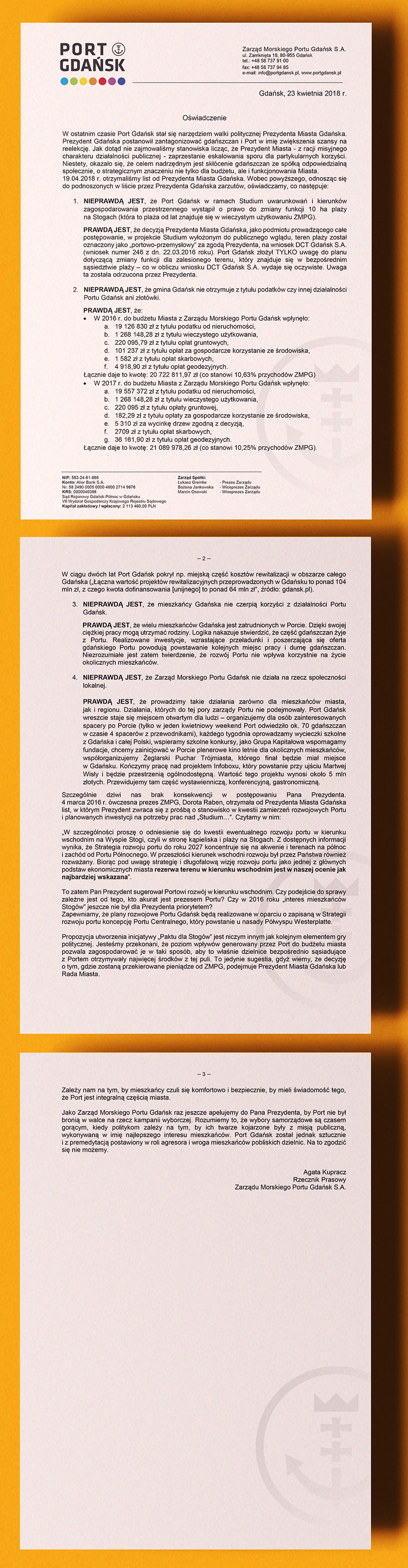 Port Gdańsk poinformował, że "nieprawdą jest, że (…) wystąpił o prawo do zmiany funkcji 10 ha plaży na Stogach". "Port Gdańsk stał się narzędziem walki politycznej Prezydenta Gdańska. Paweł Adamowicz postanowił zantagonizować gdańszczan i Port w imię zwiększenia szansy na reelekcję" - czytamy w oświadczeniu Portu.