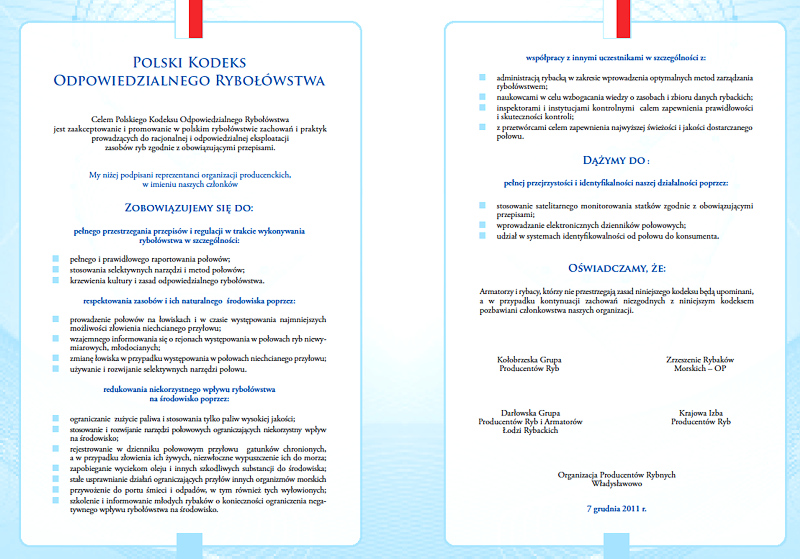 Dlatego też, cztery organizacje producenckie zdecydowały się podpisać publicznie Polski Kodeks Odpowiedzialnego Rybołówstwa, aby pokazać społeczeństwu wolę i determinację w przestrzeganiu prawa rybackiego, respektowaniu zasobów i ich naturalnego środowiska, redukowaniu niekorzystnego wpływu rybołówstwa na środowisko oraz współpracy z innymi uczestnikami, w zakresie wprowadzenia optymalnych metod zarządzania rybołówstwem, wzbogacania wiedzy o zasobach oraz zapewnienia przetwórcom i konsumentom najwyższej świeżości i jakości dostarczanego połowu.