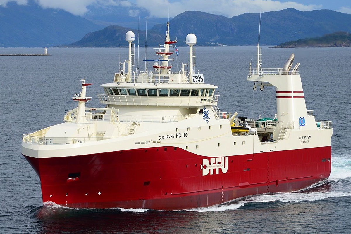 Na zdjęciu trawler-przetwórnia Cuxhaven (nr IMO 9782778; rok budowy 2014; GT 3969; nośność 1500 t) jeden z większych statków rybackich pod niemiecką banderą eksploatowany przez jednego z największych operatorów floty połowowej w Niemczech - DFFU (Deutsche Fischfang-Union), należący jednak (podobnie jak DFFU, jako spółka zależna) do islandzkiego armatora Samherji hf.