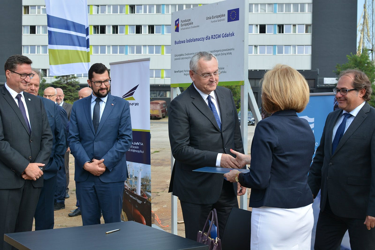 Zgodnie z umową, w ramach Projektu „Budowa lodołamaczy dla RZGW Gdańsk”, dofinansowanego z Programu Operacyjnego Infrastruktura i Środowisko 2014-2020, realizowana jest budowa lodołamacza czołowego oraz trzech lodołamaczy liniowych, które będą w służbie flotylli lodołamaczy Wód Polskich na Dolnej Wiśle. Wybudowanie czterech sztuk lodołamaczy odbywa się w trybie „zaprojektuj i wybuduj” i realizowane jest w okresie 2017-2021*. Budżet całego projektu to 74 mln. Zł, a poziom dofinansowania Unii Europejskiej - 85 proc.