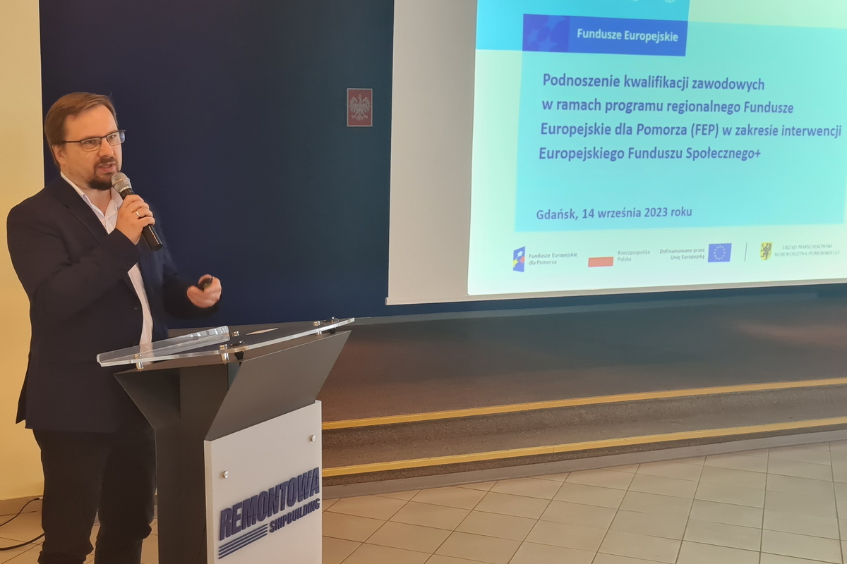 Zabierający głos jako ostatni w tej części spotkania Mirosław Zucholl, Wicedyrektor Departamentu Europejskiego Funduszu Społecznego Urzędu Marszałkowskiego omówił aspekt podnoszenia kwalifikacji zawodowych w ramach programu regionalnego Fundusze Europejskie dla Pomorza (FEP), w zakresie interwencji Europejskiego Funduszu Społecznego+. W tym kontekście wymienił kwotę przeznaczoną na kształcenie ustawiczne – 57,3 mln EUR oraz omówił cele, typy projektów i preferencje dla projektów.