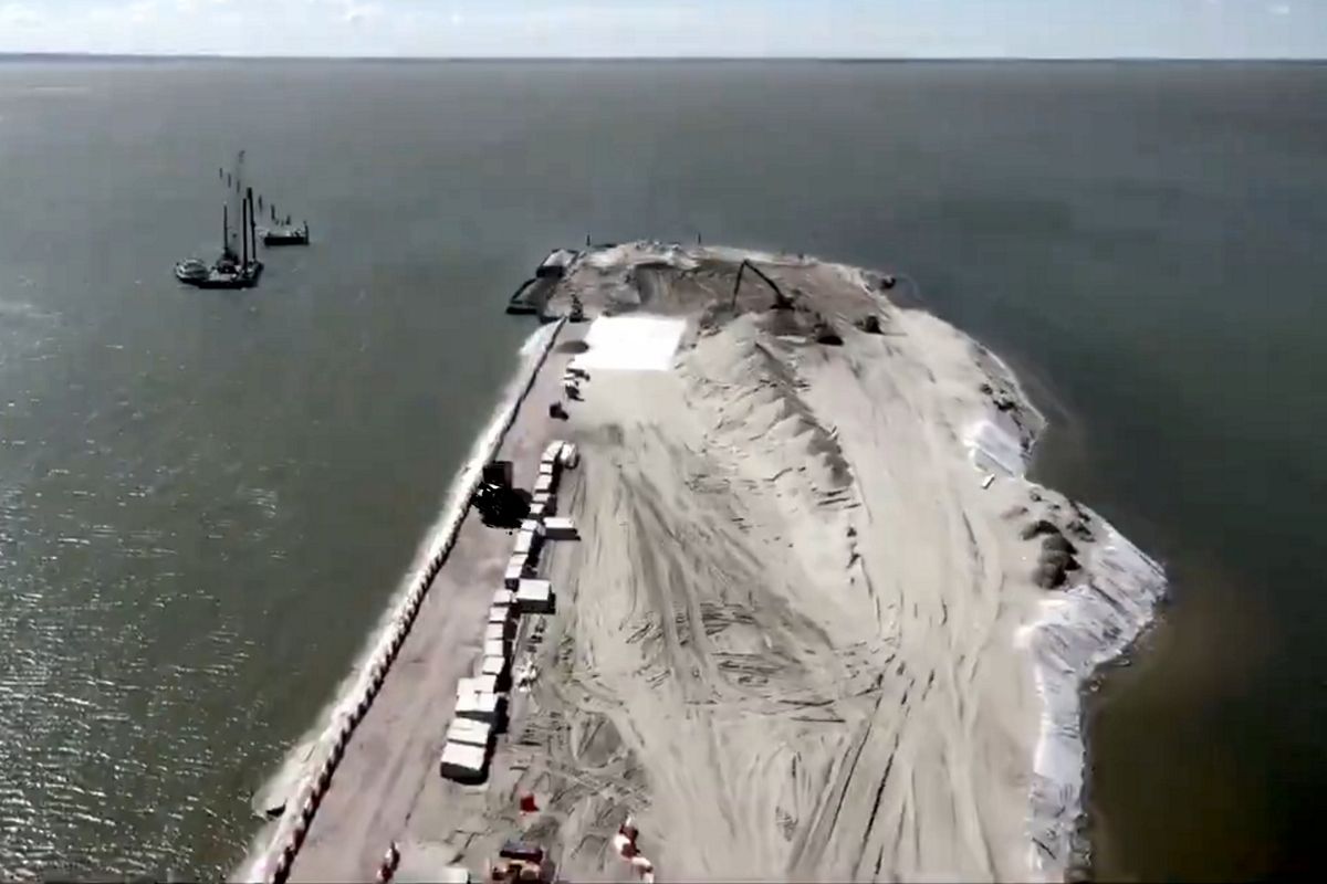 Od strony Zalewu Wiślanego zakończono budowę tymczasowej grobli oraz wbijanie ścianek dla tymczasowego nabrzeża. To nabrzeże posłuży do przeładunku materiałów potrzebnych do budowy wyspy.
