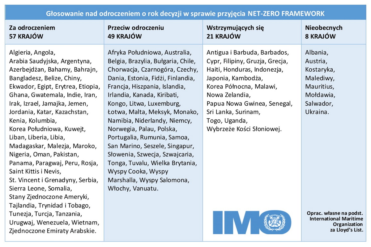 Sposób głosowania 35 największych graczy pokazał, że państwa bandery, reprezentujące ponad 54 proc. światowego tonażu, optowały za odroczeniem dekarbonizacji o rok, w porównaniu z 30 proc. głosujących, którzy chcieli przyjęcia Ram Zerowej Emisji Netto.