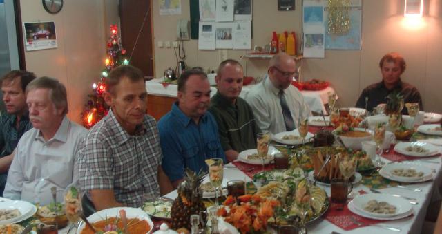 Kolację wigilijną rozpoczyna kapitan, dokładnie o godzinie 17. czasu pokładowego, składając załodze życzenia i przekazując życzenia od armatora. A potem – tak jak w kraju, - wszyscy dzielą się opłatkiem i życzą sobie indywidualnie wszystkiego najlepszego. Kolacja trwa zazwyczaj do 20. chociaż, jeśli przy stole jest znakomita atmosfera, to przeciąga się ona nawet do godzin nocnych. Potem każdy z marynarzy zaszywa się zazwyczaj w swojej kabinie i stara się połączyć ze swoimi bliskimi za pośrednictwem telefonu komórkowego. Jeśli nie „złapie” zasięgu może skorzystać ze statkowych satelitarnych środków łączności.