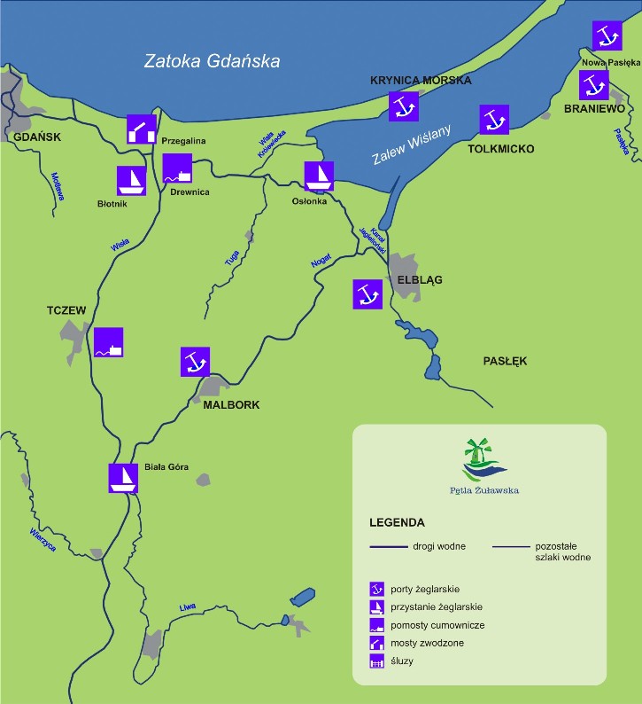 W 16 miejscach na Żuławach, Warmii i Powiślu, połączonych śródlądowym szlakiem rzek, kanałów (oraz Zalewu Wiślanego) powstały przystanie żeglarskie, pomosty oraz porty żeglarskie - m.in.