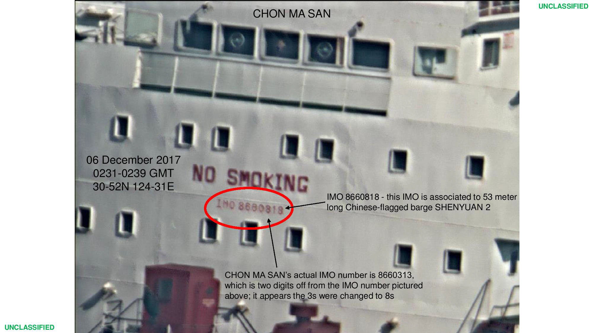 - Chon Ma San - państwo bandery: Ludowo-Demokratyczna Republika Korei (Korea Północna); nr IMO 8660313; powiązany z: Korea Achim Shipping Co.