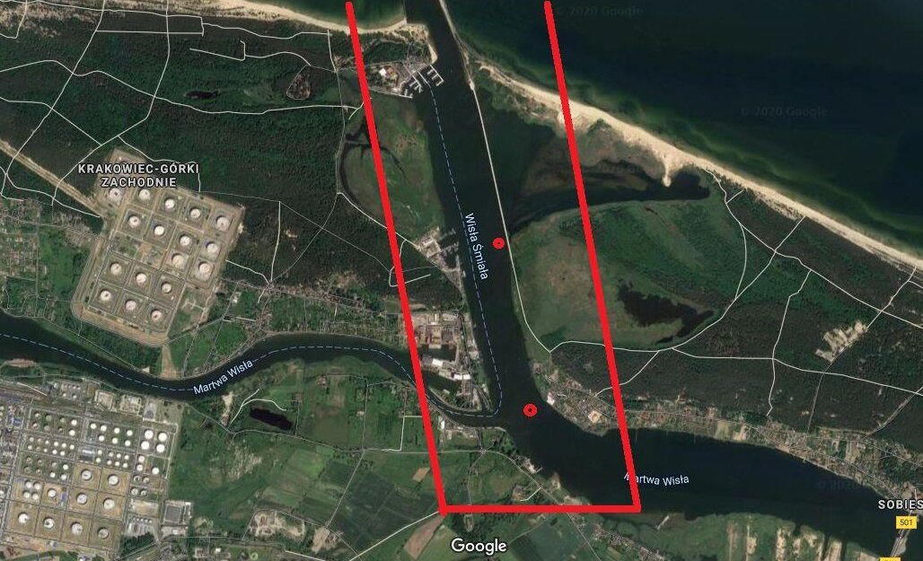 · Trasy holowania obiektów niebezpiecznych w kanale Wisły Śmiałej, od pozycji zalegania do w kierunku ujścia do Zatoki Gdańskiej, do wyznaczonej pozycji neutralizacji.