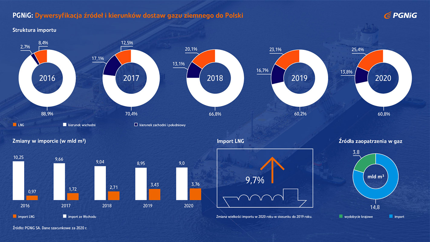 W 2020 roku PGNiG sprowadziło do Polski ok. 3,76 mld m sześc. skroplonego gazu ziemnego - o 9,7 proc. więcej niż rok wcześniej. Import LNG wzrósł o ok. 0,33 mld m sześc. (po regazyfikacji) w stosunku do roku 2019. W całej strukturze importu LNG osiągnęło udział 25,4 procenta. Import z kierunku wschodniego wyniósł w 2020 roku 9,0 mld m sześc. w porównaniu z 8,95 mld m sześc. rok wcześniej.