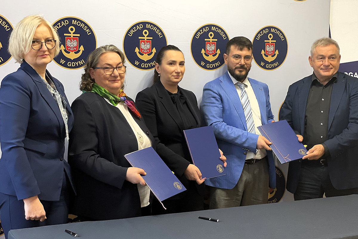 Urząd Morski w Gdyni - po podpisaniu umowy na tor wodny na rzece Elbląg. Od lewej: Katarzyna Brzózka, główny księgowy Urzędu Morskiego w Gdyni, Anna Stelmaszyk-Świerczyńska, dyrektor Urzędu Morskiego w Gdyni, Barbara Olczyk, z-ca dyrektora Urzędu Morskiego w Gdyni ds. Inwestycyjnych, Fatih Budan, prezes zarządu Fabe Polska Sp. z o.o., Zbigniew Barański, prokurent, Przedsiębiorstwo Robót Czerpalnych i Podwodnych Sp. z o.o. Urząd Morski w Gdyni podpisał umowę na roboty pogłębiarskie na rzece Elbląg. Jest to IV Etap "Budowy drogi wodnej łączącej Zalew Wiślany z Zatoką Gdańską".