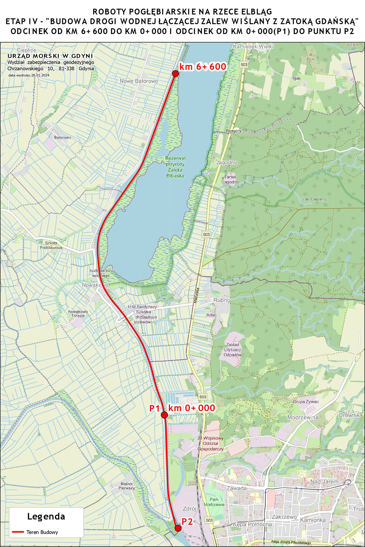 W ramach kontraktu, na rzece Elbląg wykonany zostanie tor wodny o długości 8,6 km i głębokości 5 m. W zadaniu wyszczególniono prace na odcinku 6,6 km od Zalewu Wiślanego w górę rzeki oraz 2 km pomiędzy punktami P1 i P2, tj. mniej więcej od zrzutu oczyszczalni ścieków do rozwidlenia rzeki i Kanału Jagiellońskiego. Na odcinku P1-P2 przeprowadzone zostaną badania i oczyszczanie dna z przeszkód ferromagnetycznych (np. złom, elementy żelbetowe, przeszkody wielkogabarytowe, historyczne pozostałości militarne). Wykonane też będzie na nim nowe oznakowanie nawigacyjne w postaci 8 pław: 4 walcowanych czerwonych po lewej stronie i 4 stożkowych zielonych po prawej stronie.
