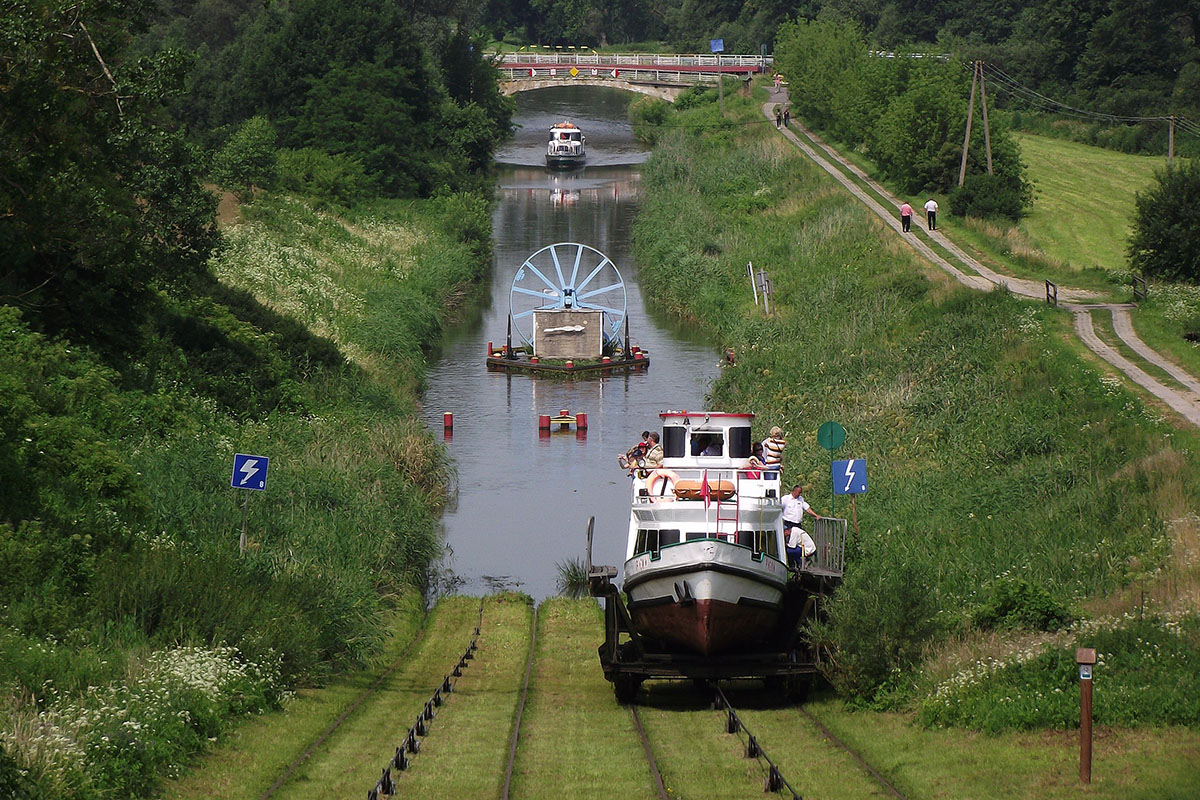 Statki turystyczne i inne jednostki pływające, żeby pokonać różnicę poziomów, są umieszczane na wózkach i przeciągane po torowisku za pomocą stalowych lin, które porusza koło wodne. Na kanale są też cztery śluzy: Miłomłyn, Zielona, Mała Ruś i Ostróda.