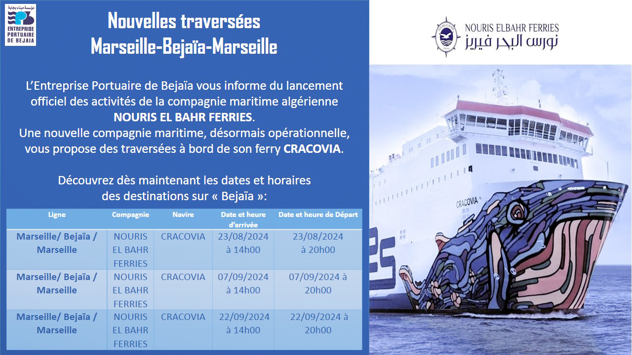 "Rynek transportu morskiego między Algierią a Francją zyskuje powiew świeżości wraz z pojawieniem się nowej algierskiej firmy żeglugowej. Pod nazwą Nouris El Bahr Ferries, przewoźnik ten uruchomi swoje pierwsze rejsy między portem Bidżaja i Marsylią 23 sierpnia, wywołując zmiany w sektorze od dawna zdominowanym przez Algérie Ferries. Wybór Bidżaji jako strategicznego portu macierzystego wynika z położenia geograficznego miasta w centrum kraju, co czyni go idealnym węzłem komunikacyjnym" – podkreśla Observalgerie.com.